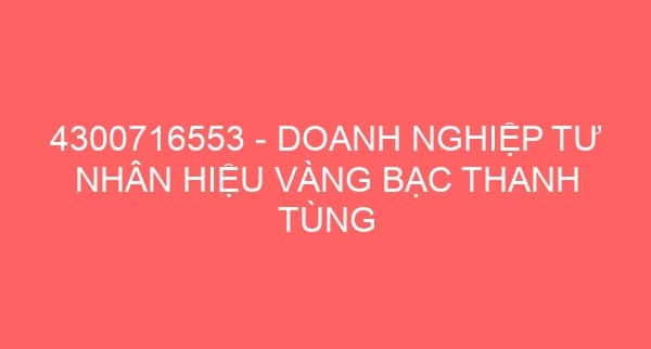 4300716553 – DOANH NGHIỆP TƯ NHÂN HIỆU VÀNG BẠC THANH TÙNG Đăng vào 22/04/2012Tác giả daithinh 0 Mã số thuế: 0318450120-001 – Đại diện pháp luật: Trần Tấn AnĐịa chỉ: 135/2 Tth21, Phường Tân Thới Hiệp, Quận 12, Tp Hồ Chí MinhDoanh nghiệp liên quan:Chi Nhánh Doanh Nghiệp Tư Nhân Vàng Lâm Kim Tùng – Hiệu Vàng Kim TùngDoanh Nghiệp Tư Nhân Hiệu Vàng Bạc Thanh TùngDoanh Nghiệp Tư Nhân Hiệu Vàng Hoa TùngDoanh Nghiệp Tư Nhân Hiệu Vàng Bảy Hoa TùngDoanh Nghiệp Tư Nhân Hiệu Vàng Bạc Thanh HoàngDoanh Nghiệp Tư Nhân Hiệu Vàng Bạc Đức ThanhDoanh Nghiệp Tư Nhân Hiệu Vàng Bạc Kim DũngDoanh Nghiệp Tư Nhân Hiệu Vàng Bạc Châu ánh MinhDoanh Nghiệp Tư Nhân Hiệu Vàng Bạc Dung Đức4300798884 – DOANH NGHIỆP TƯ NHÂN HIỆU VÀNG BẠC KIM THUẬN